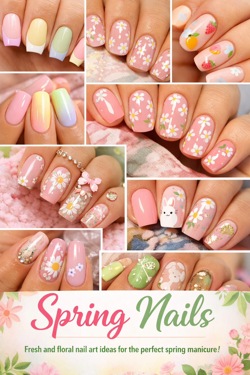 Looking for fresh spring nails inspiration? 🌸 Discover the prettiest pastel French tips, cute floral nail art, soft ombre designs, fruit accents, and adorable bunny details perfect for the season! These trendy spring manicure ideas are ideal for short nails, almond shapes, or gel nails. Save this pin for your next salon visit or DIY nail day!